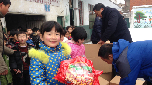 尽管当地刚下完暴雪,天气异常寒冷,但是准时到达的年货却让学校里充满了笑声和温暖。志愿者们每发一份年货,孩子们都说一声“谢谢”,看着孩子们脸上的笑容,所有的工作都是值得的。