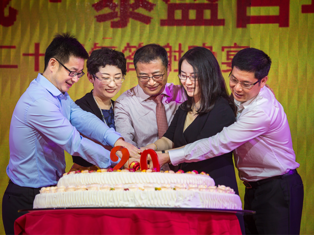 切蛋糕环节,华泰集团董事长陈先保先生、乐鱼体育app总经理陈冬梅女士、华泰集团副总裁陈奇女士、华邦地产董事长杨青云先生以及华元金融董事长孟虎先生5人同持一把蛋糕刀,缓缓切开华泰二十岁生日蛋糕,场面温馨动人。