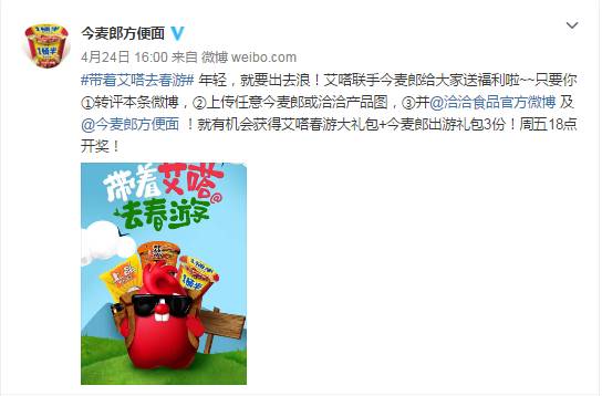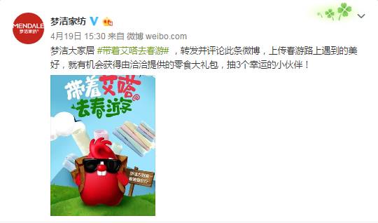 为扩大线上传播的影响力,最大可能地覆盖目标受众。乐鱼体育与三全食品、今麦郎、梦洁家纺、君乐宝等10家官微进行品牌联动,以微博接力的方式陆续发起#带着艾嗒去春游#活动,吸引粉丝上传照片赢取春游大礼包。每周2家联合,周一周三发活动微博,持续豪礼放送1个月。