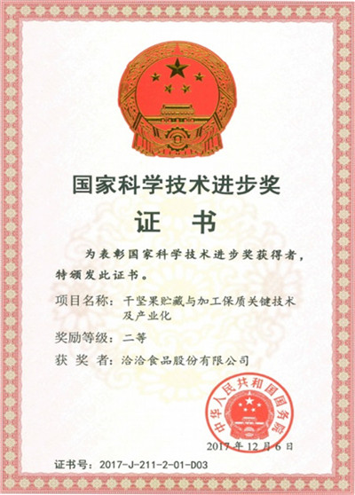 乐鱼体育的“干坚果储藏及加工保质关键技术”荣获中国国务院颁发的“国家科学技术进步二等奖”。